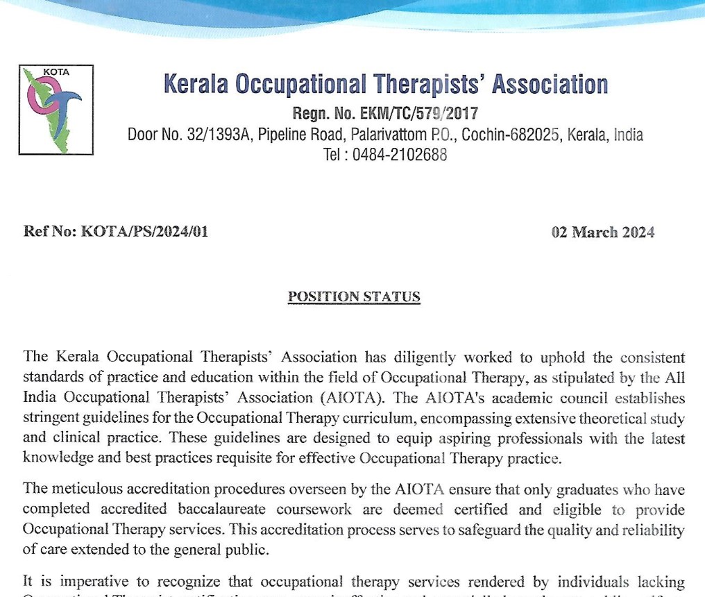 Kerala Occupational Therapists’ Association (KOTA) is formed by Occupational Therapy practitioners from Kerala to support and nurture the study and practice of Occupational Therapy in Kerala. KOTA is the branch of the All India Occupational Therapists' Association (AIOTA) in Kerala.